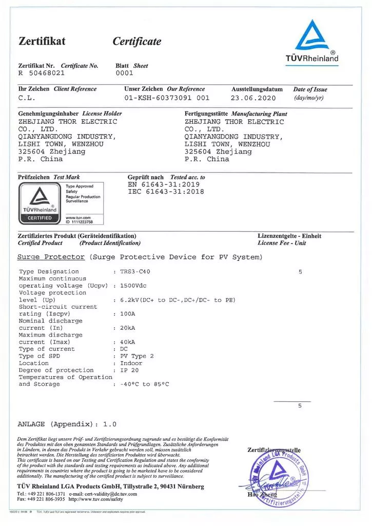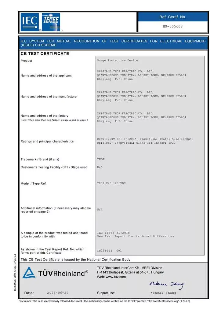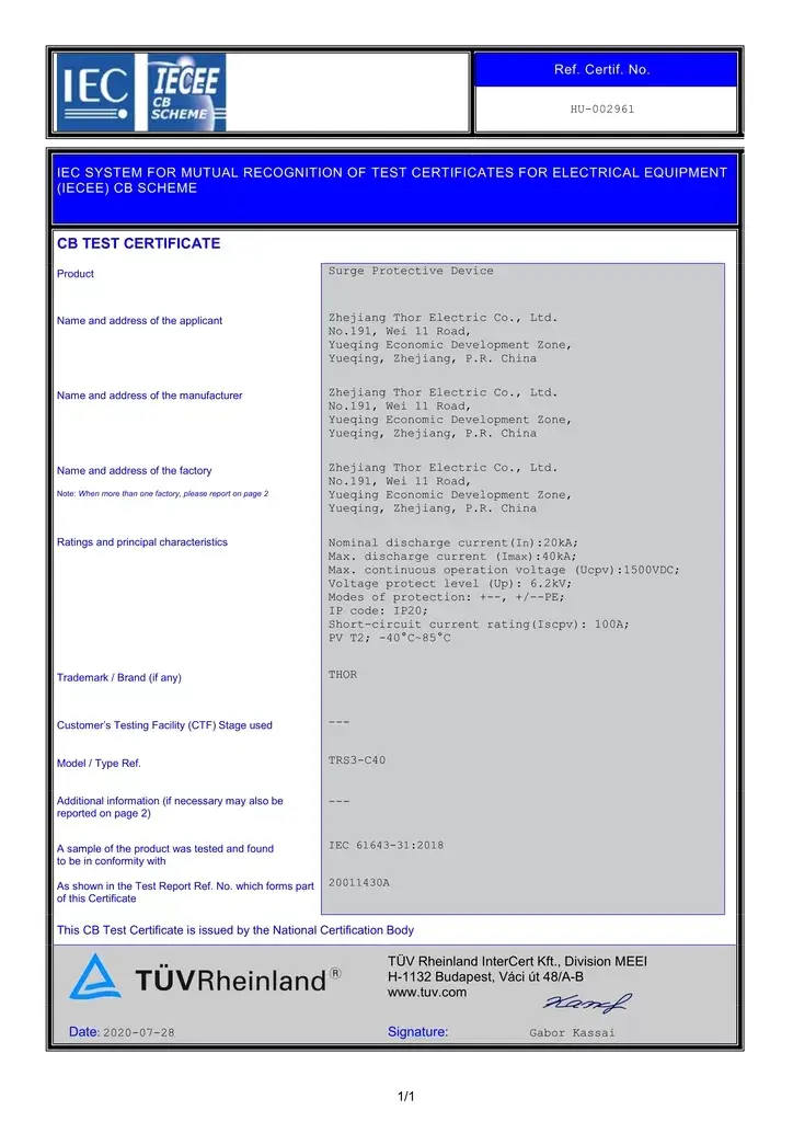 CB Certificate For THOR TRS3-C40 1500V