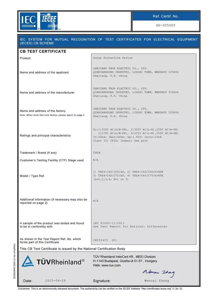 CB Certificate For THOR TRS4-C40 275V