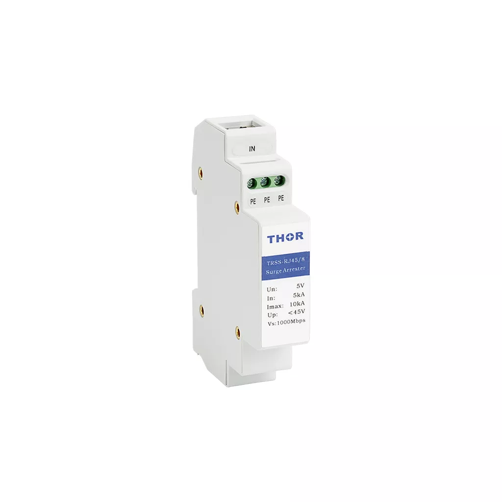 The TRSS-RJ45/8 is a high-performance, compact PoE surge protector optimized for modern Industrial Control environments and Power over Ethernet systems. It provides comprehensive 8-line protection across all pins, covering both Gigabit Data (1/2/3/6) and PoE (4/5/7/8) power paths. Its space-saving 35mm Din Rail design allows for rapid integration into dense server racks and high-speed routers, safeguarding them against severe transient overvoltages. As a Cat6-compliant surge protection device, it supports data rates up to 1000Mbps with a minimal insertion loss of ≤ 0.1dB.